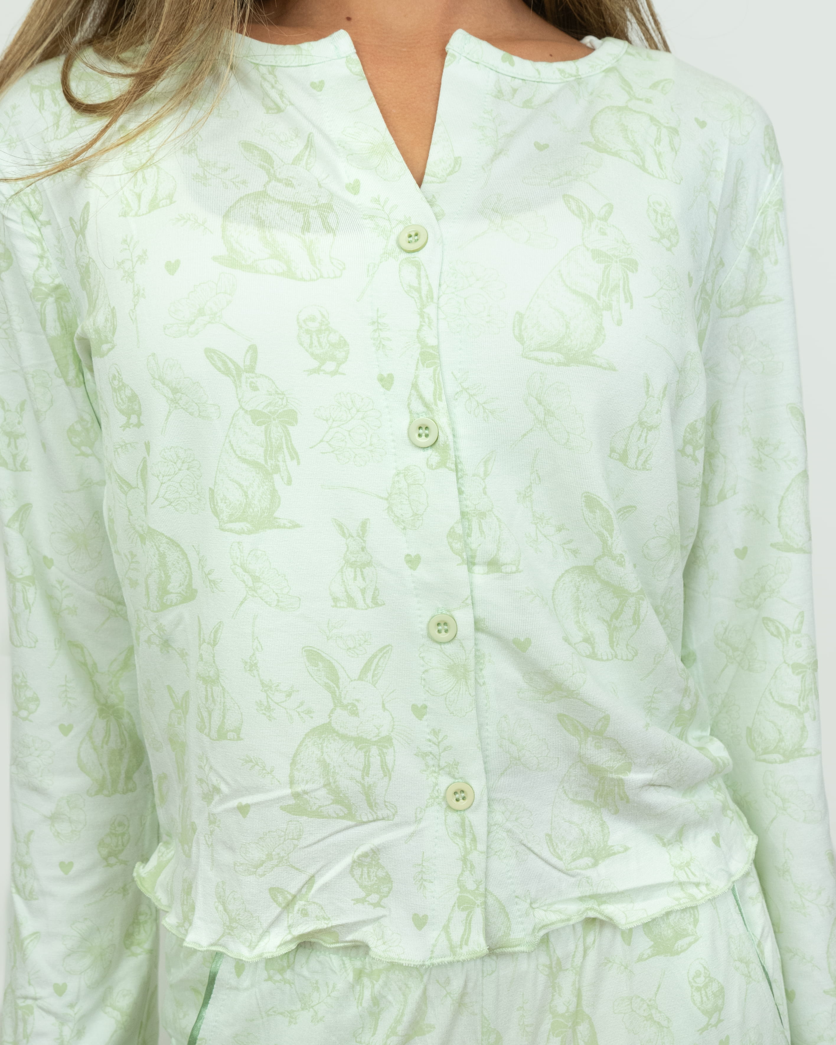 Zaprojektowany wyłącznie dla Kolekcji Wielkanocnej, ten zestaw łączy przytulny komfort z charakterystyczną dla P.Louise pewnością siebie. To taki komplet piżamy, po który sięgniesz w chłodne wieczory, niedzielne zabiegi pielęgnacyjne i w każdą chwilę pomiędzy. Wystarczająco ładny, aby się nim pochwalić, i wystarczająco wygodny, aby w nim mieszkać.